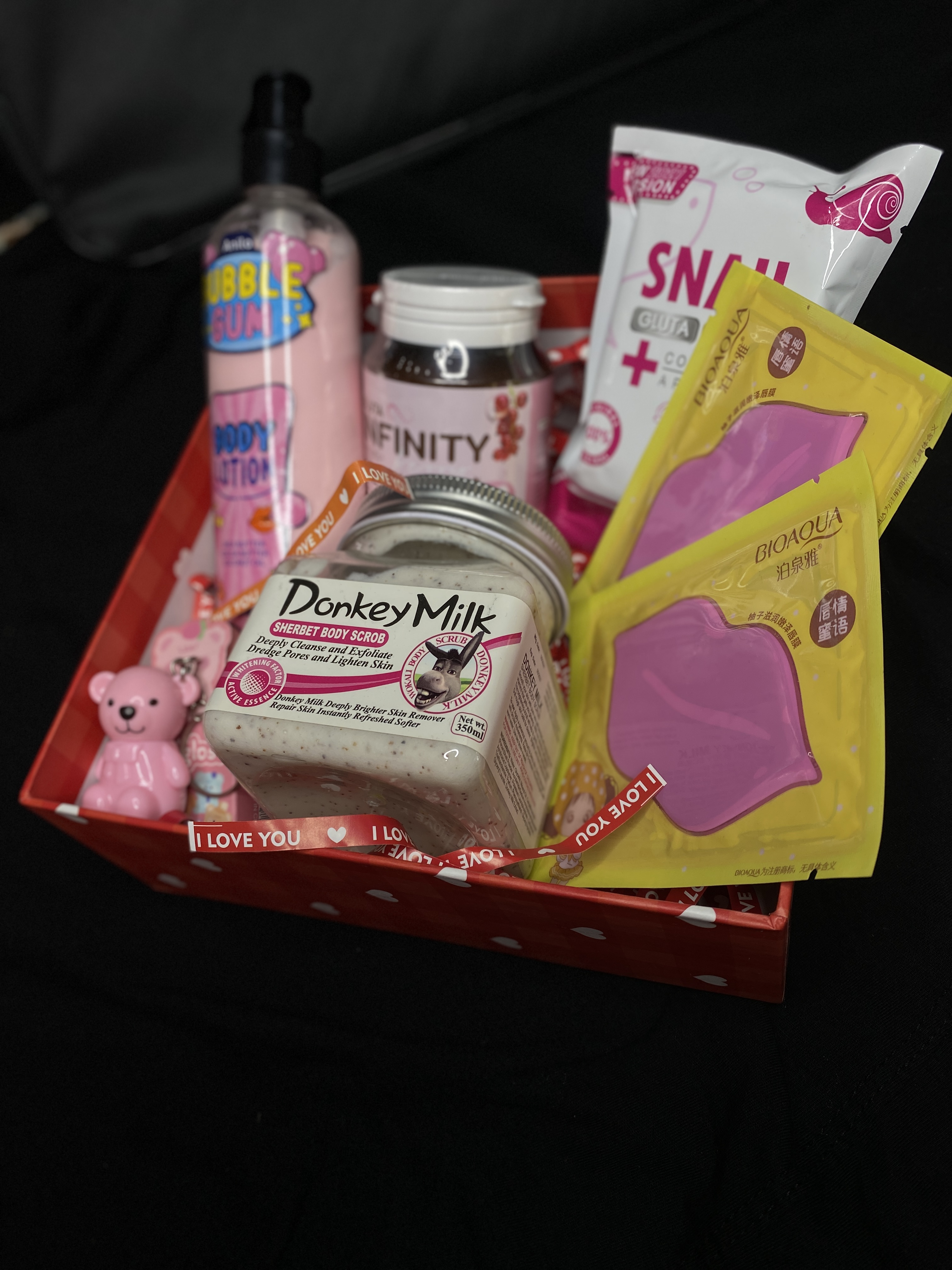 ترکیبات : گلوتااینفینیتی، لوسیون ادامسی ، رژ خرسی ، اسکراب دانکی میلک ، ماسک لب، صابون گلوتاتیون
